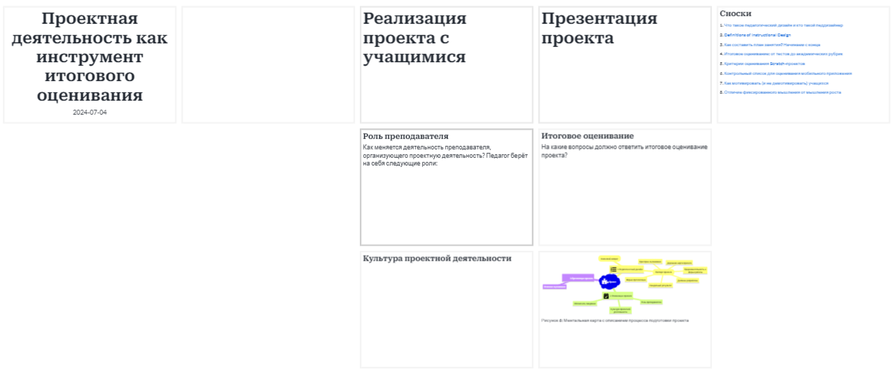 Пример такой презентации можно увидеть в предыдущей заметке о проектной деятельности. И сама заметка и презентация созданы на основе одного документа. С помощью особой разметки я указывал, какие фрагменты текста останутся в презентации, а какие в неё не попадут.