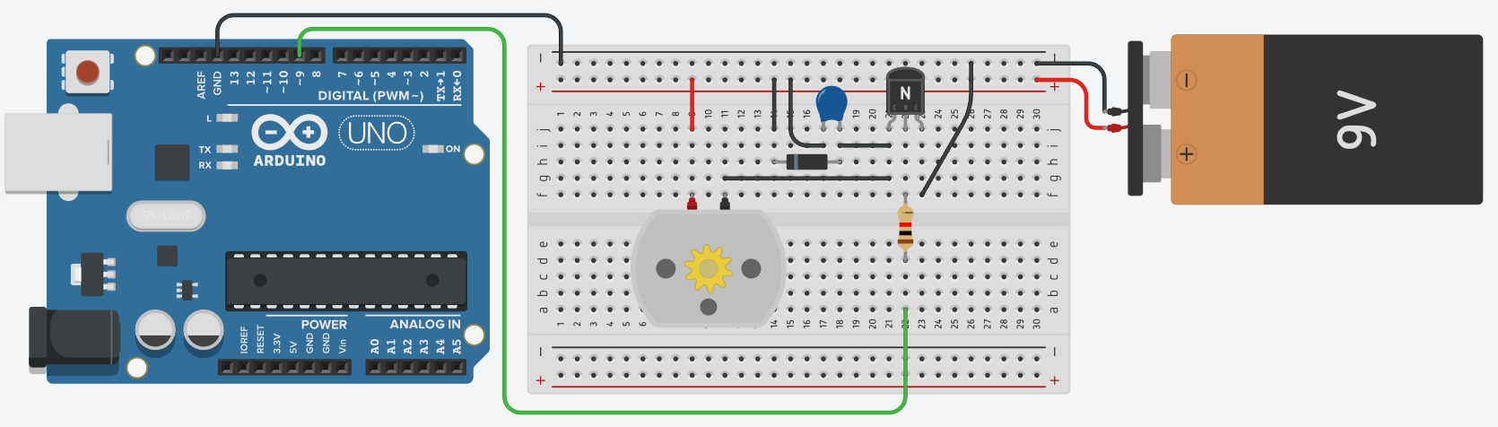 Соберите схему для управления двигателем постоянного тока с помощью биполярного транзистора.