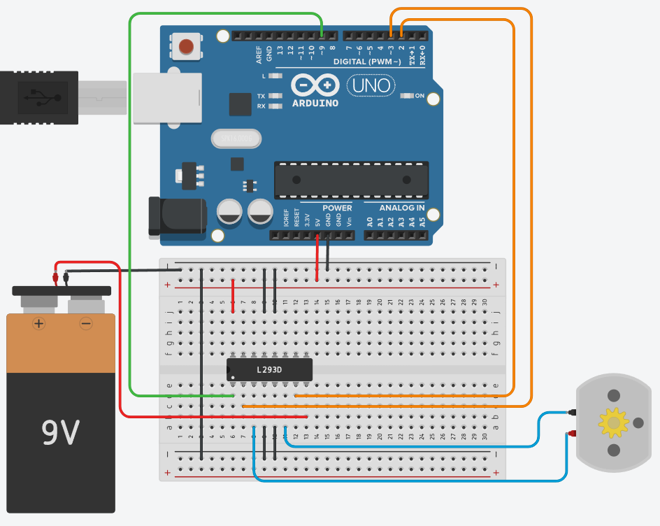 Используем драйвер мотора L293D для управления направлением и скоростью вращения мотора.