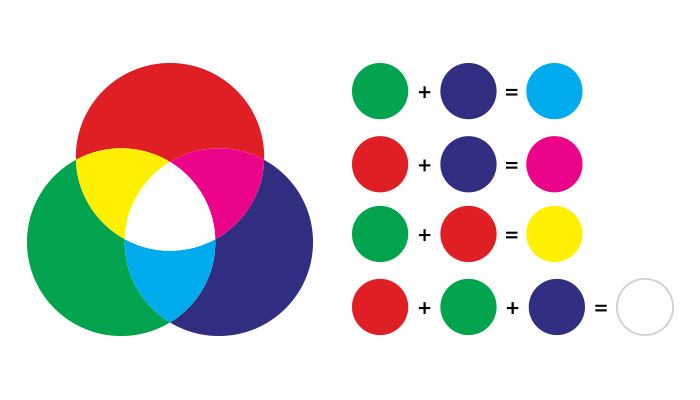Основные три цвета - красный, зелёный и синий. При смешивании пар цветов получаются следующие комбинации: