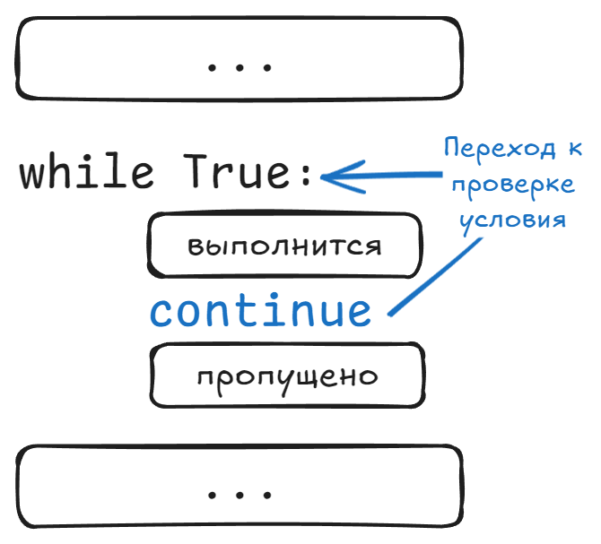Инструкция continue прерывает выполнение текущей итерации цикла. Интерпретатор вернётся к проверке условия цикла.