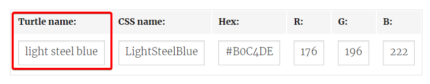 На сайте trinket.io есть интерактивная библиотека цветов. Кликните на желаемый цвет и скопируйте его название, чтобы использовать его в методах pencolor() и fillcolor().