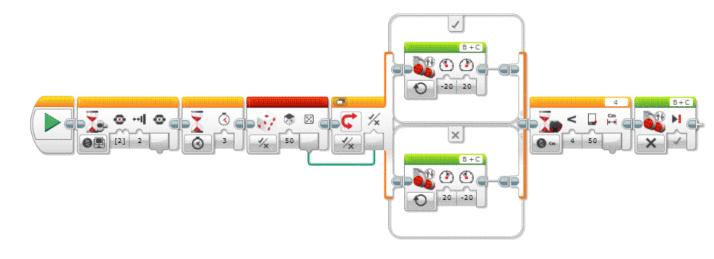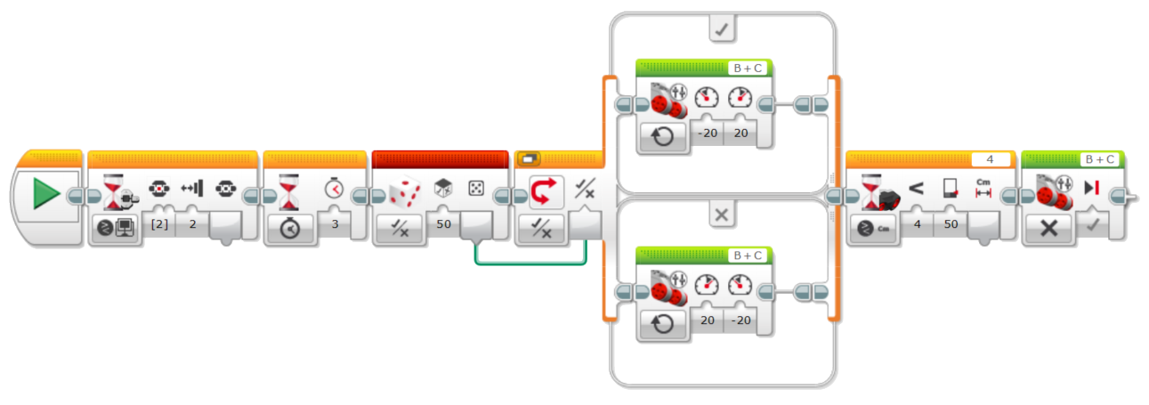 В первую очередь реализуем поиск противника. Робот будет вращаться на месте, пока не увидит робота на расстоянии меньшем чем 50 см. Направление вращения будем выбирать случайным образом.