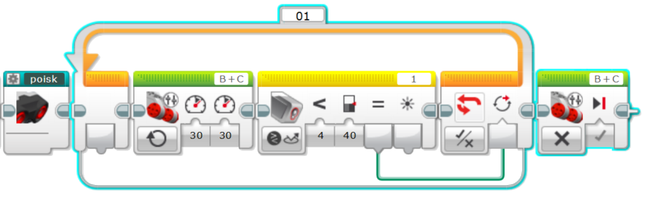 Для обнаружения границ ринга используем режим измерения уровня отражённого света. Движение робота и проверку условия поместим в цикл. Цикл с командой движения будет завершаться, если выполнится условие в блоке Датчик цвета.