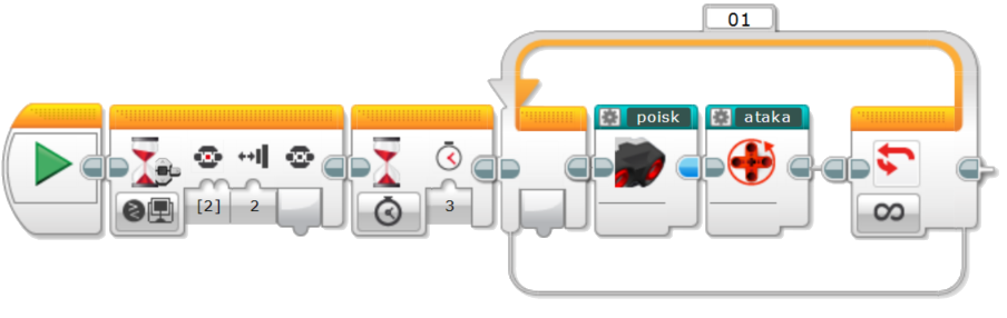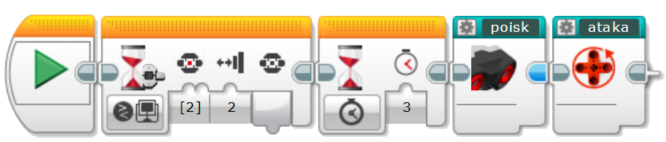 Добавьте собственный блок ataka перед первым циклом. Сразу после паузы, робот поедет в сторону линии и только потом начнёт поиск противника.