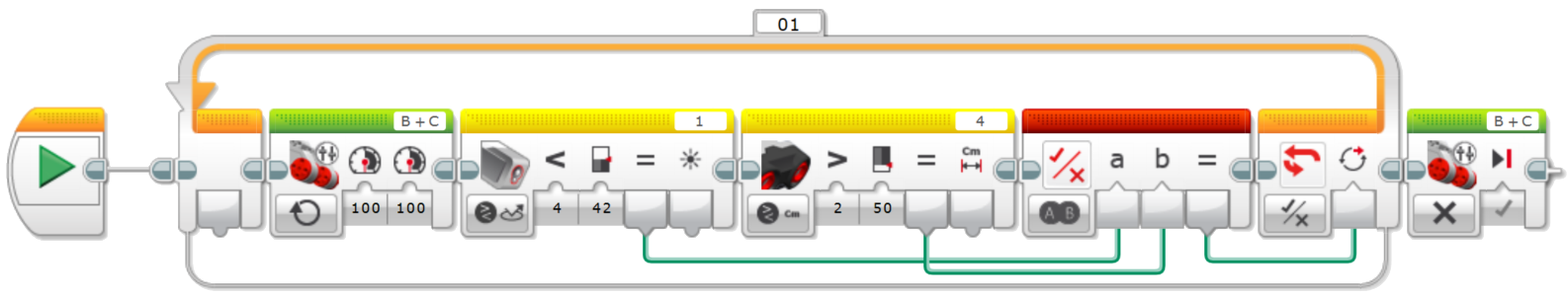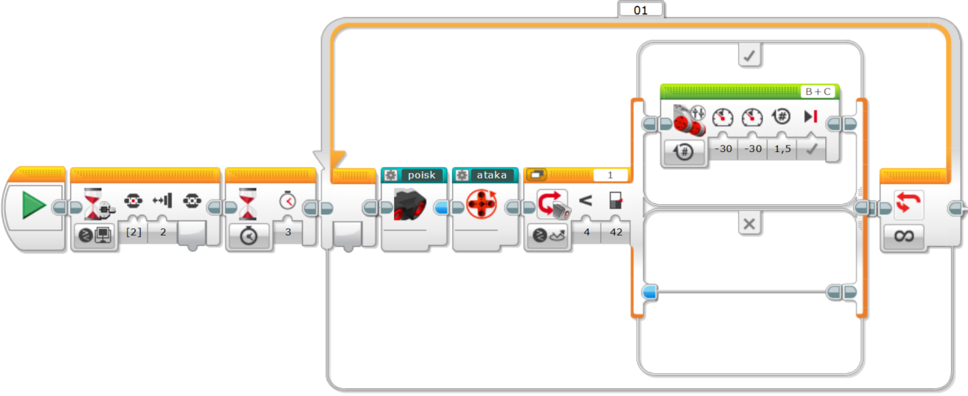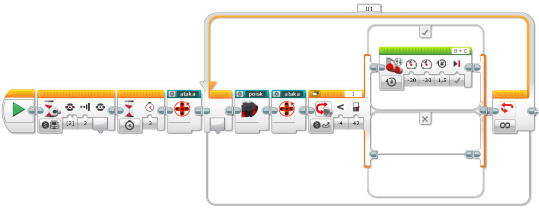 Сейчас после обнаружения противника робот будет ехать до границы ринга. Но робот соперника также может двигаться в это время. Исправим алгоритм атаки таким образом, чтобы робот останавливался, если видит границы ринга ИЛИ потерял соперника из виду.